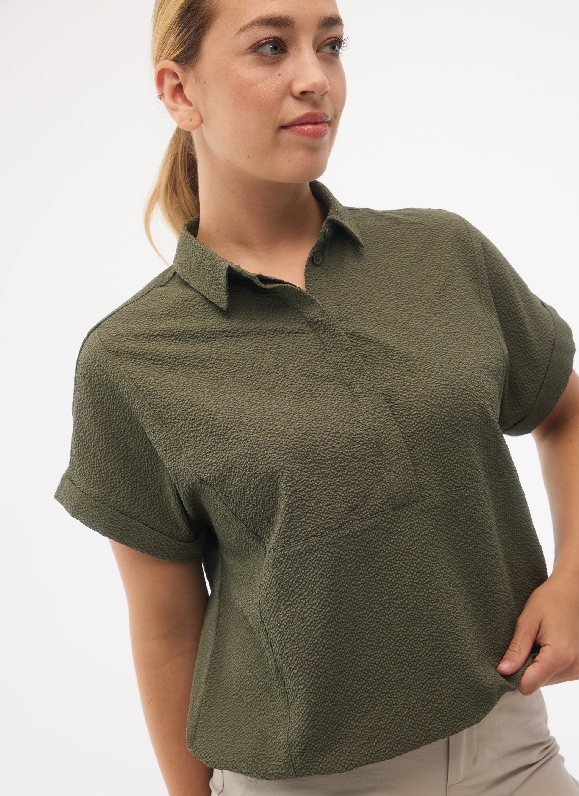 Designed for adventure, this short sleeve top blends modern style and performance. Made from Mobius™ Seersucker, a stretchy, quick-drying, and wrinkle-resistant recycled polyester fabric, it features a half-zip collar and concealed drawcords at the hem for a custom fit—perfect for exploring in comfort and style.