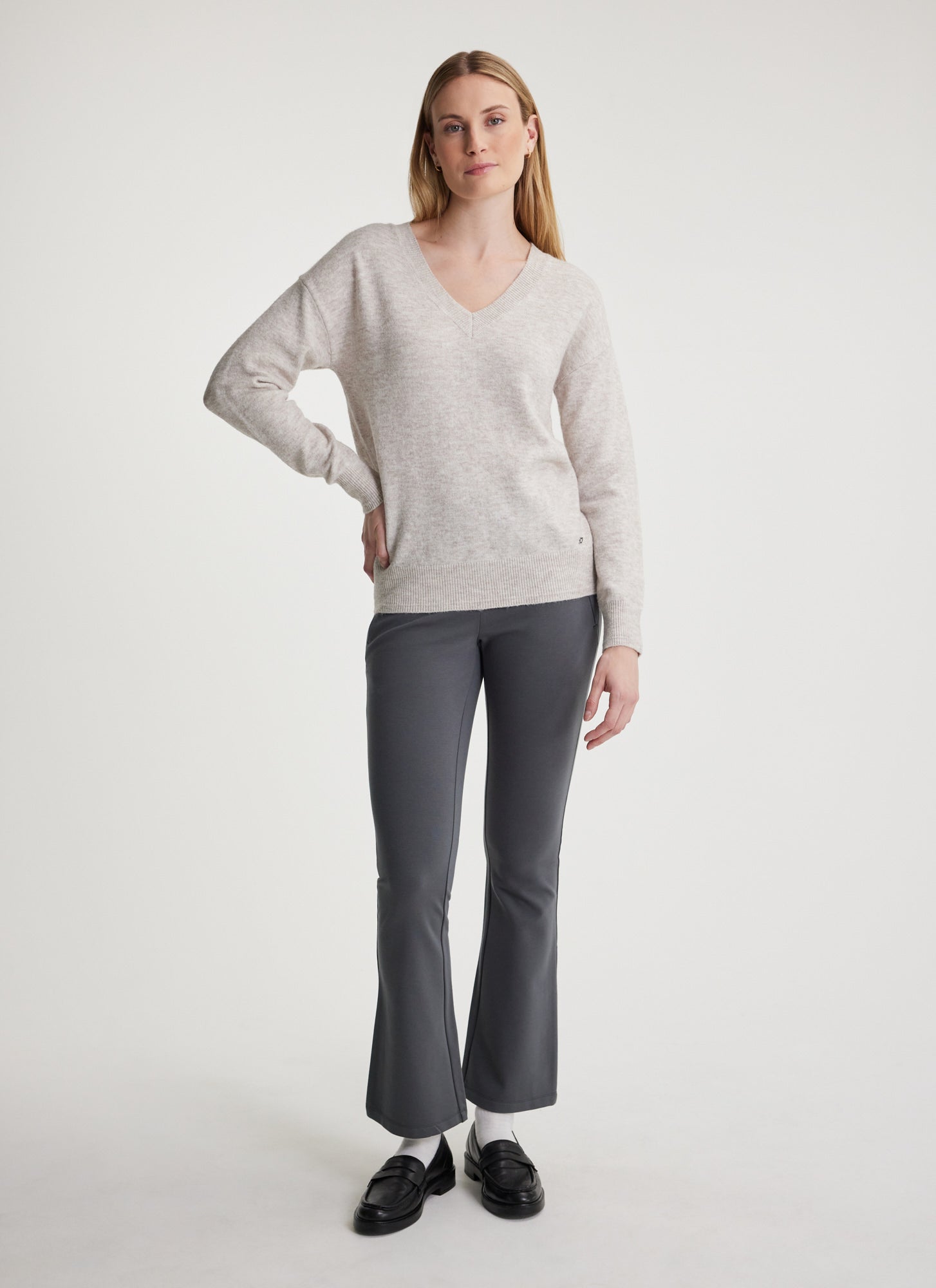 Embrace the colder season in style and comfort with this classic V-neck sweater. Crafted from soft, fuzzy, eco-friendly knit fabric made with recycled polyester and a touch of wool.