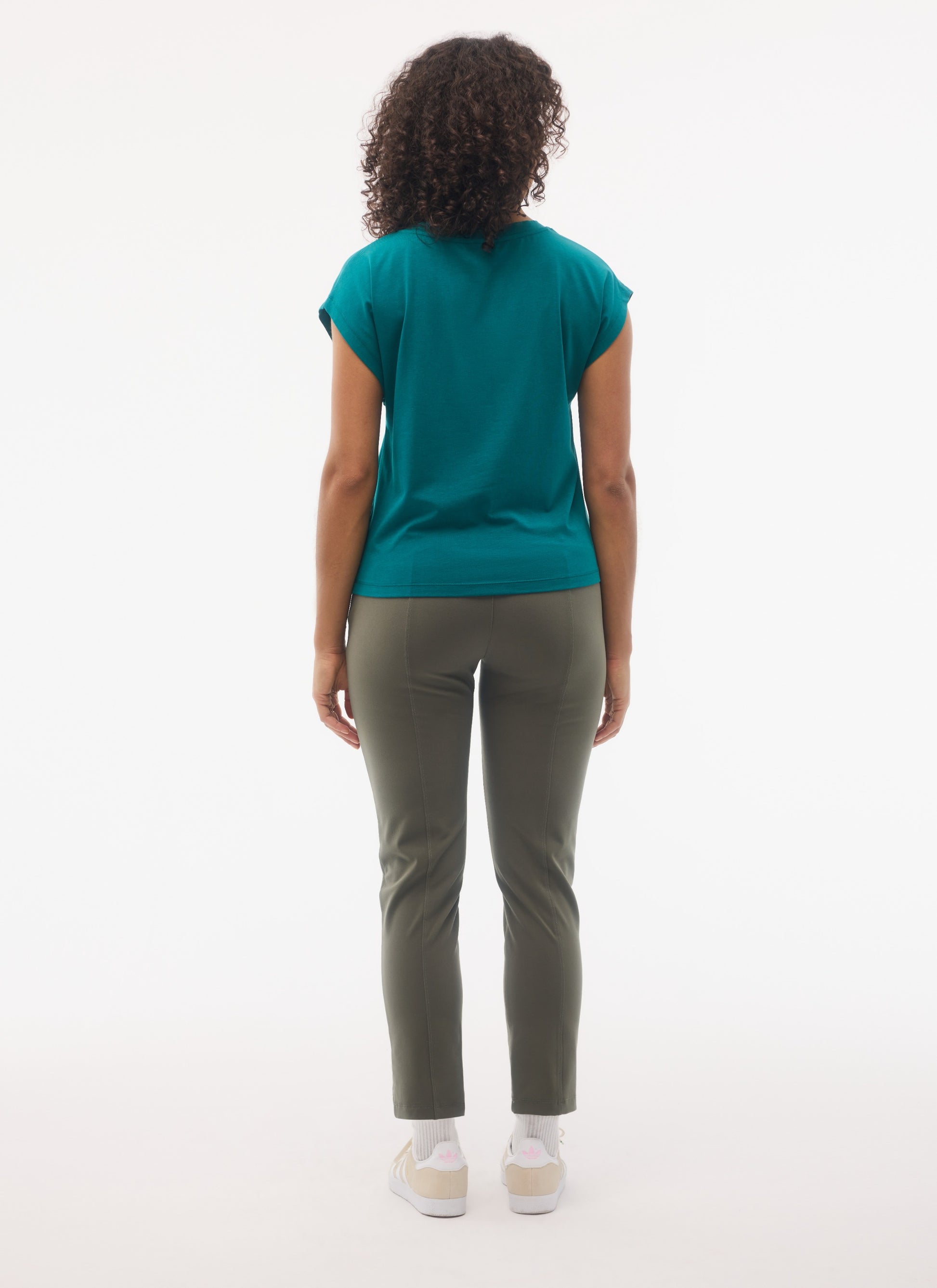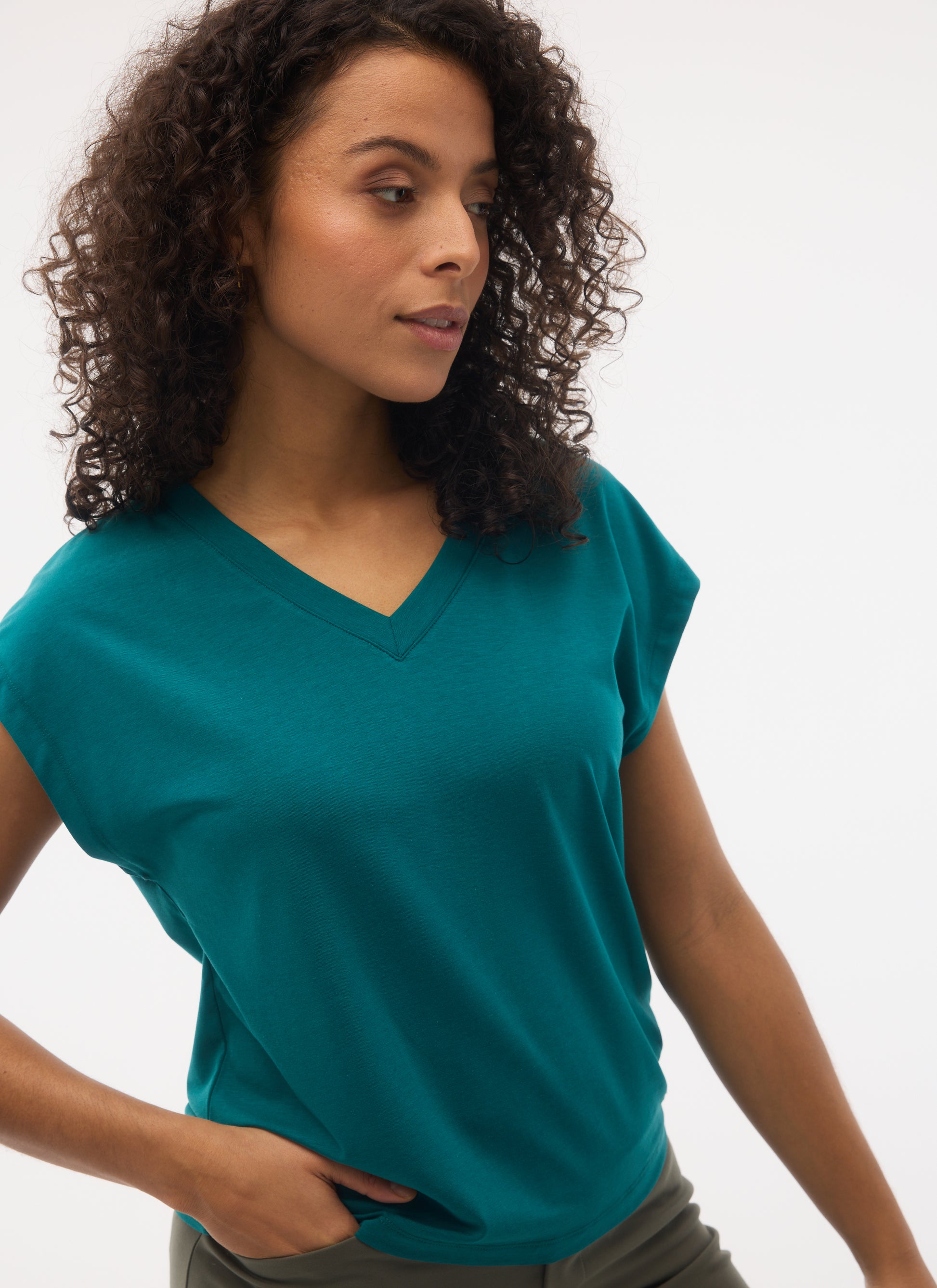 Its sleek design and V-neckline add a feminine touch, making this cap sleeve top an essential everyday staple. Crafted from an ultra-soft fabric blend of organic cotton, TENCEL™ Lyocell, and elastane.
