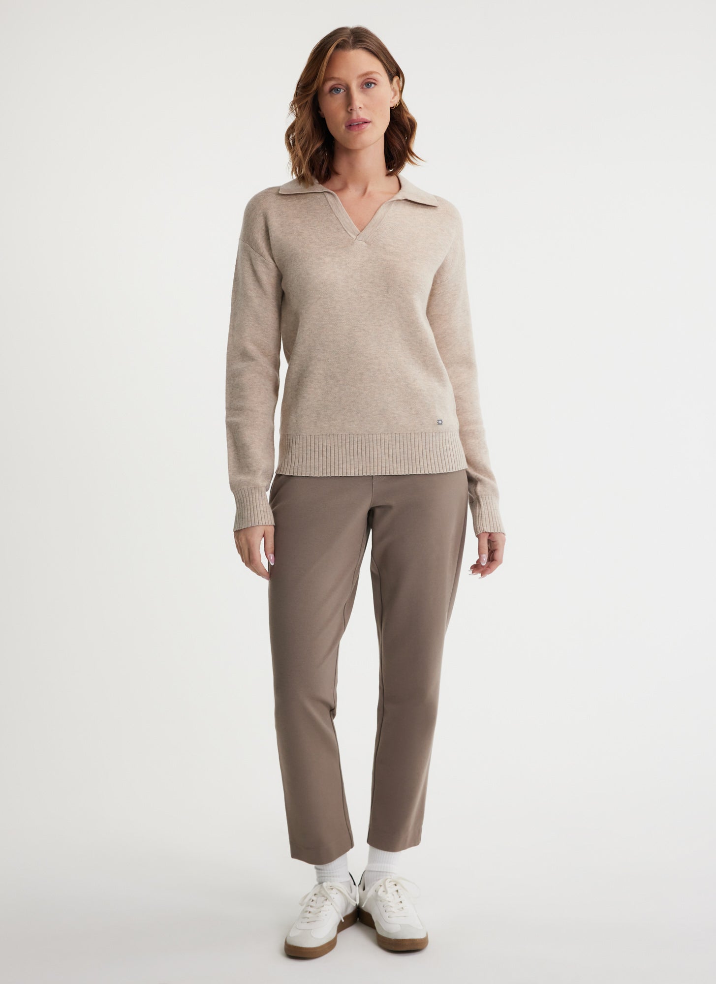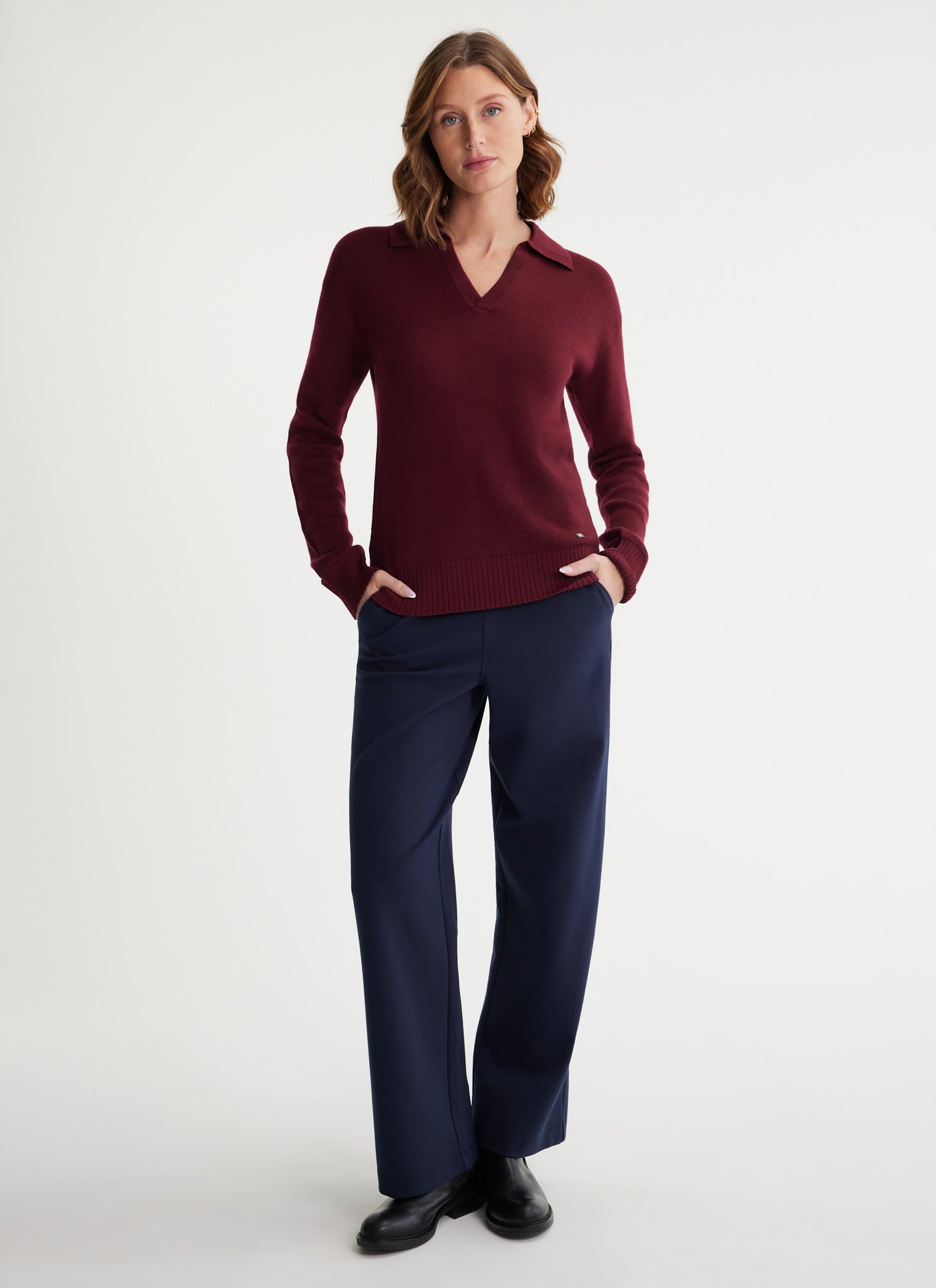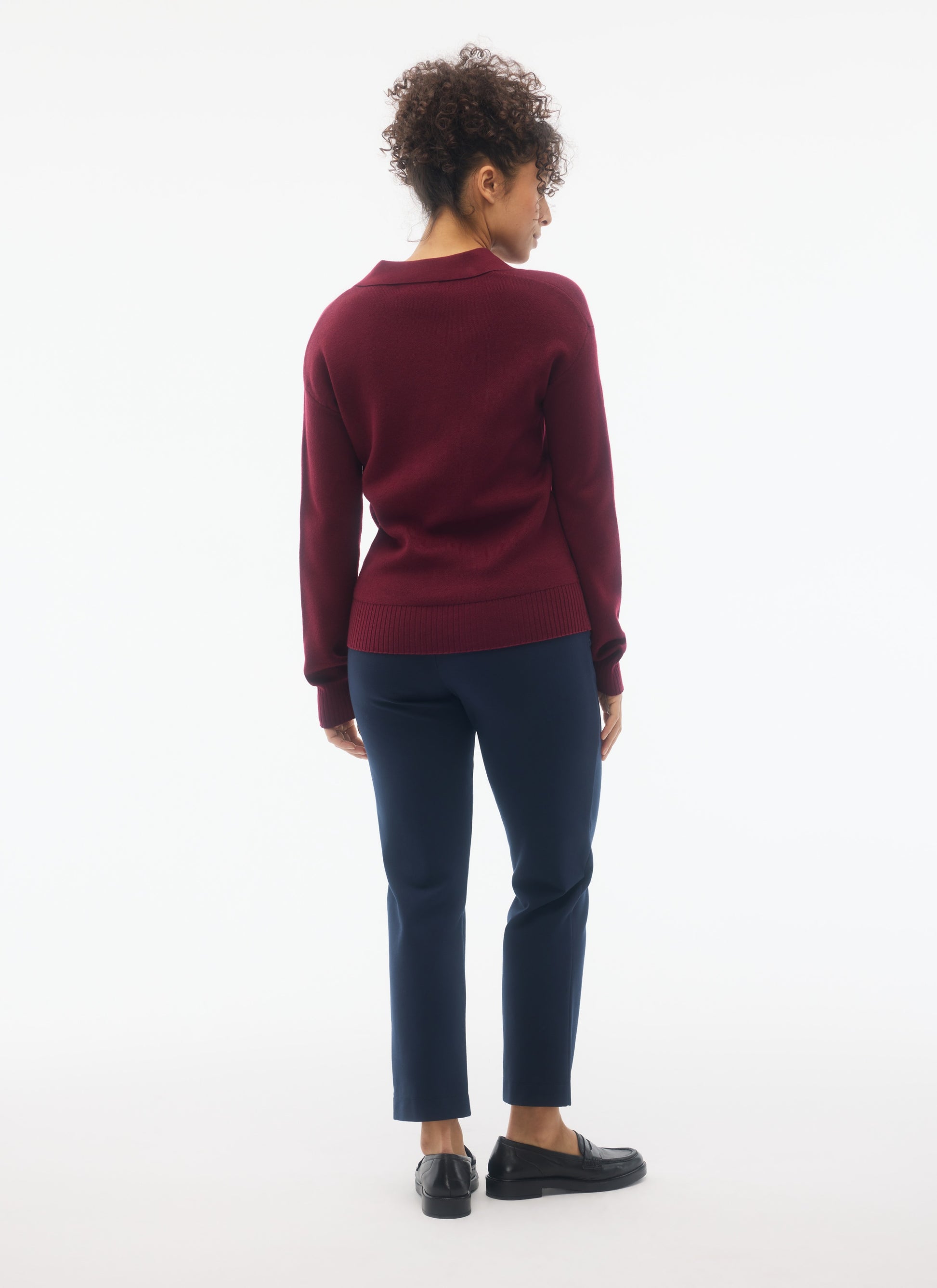Polo collar with V-neck and beautifully finished rib details at hems and collar.
