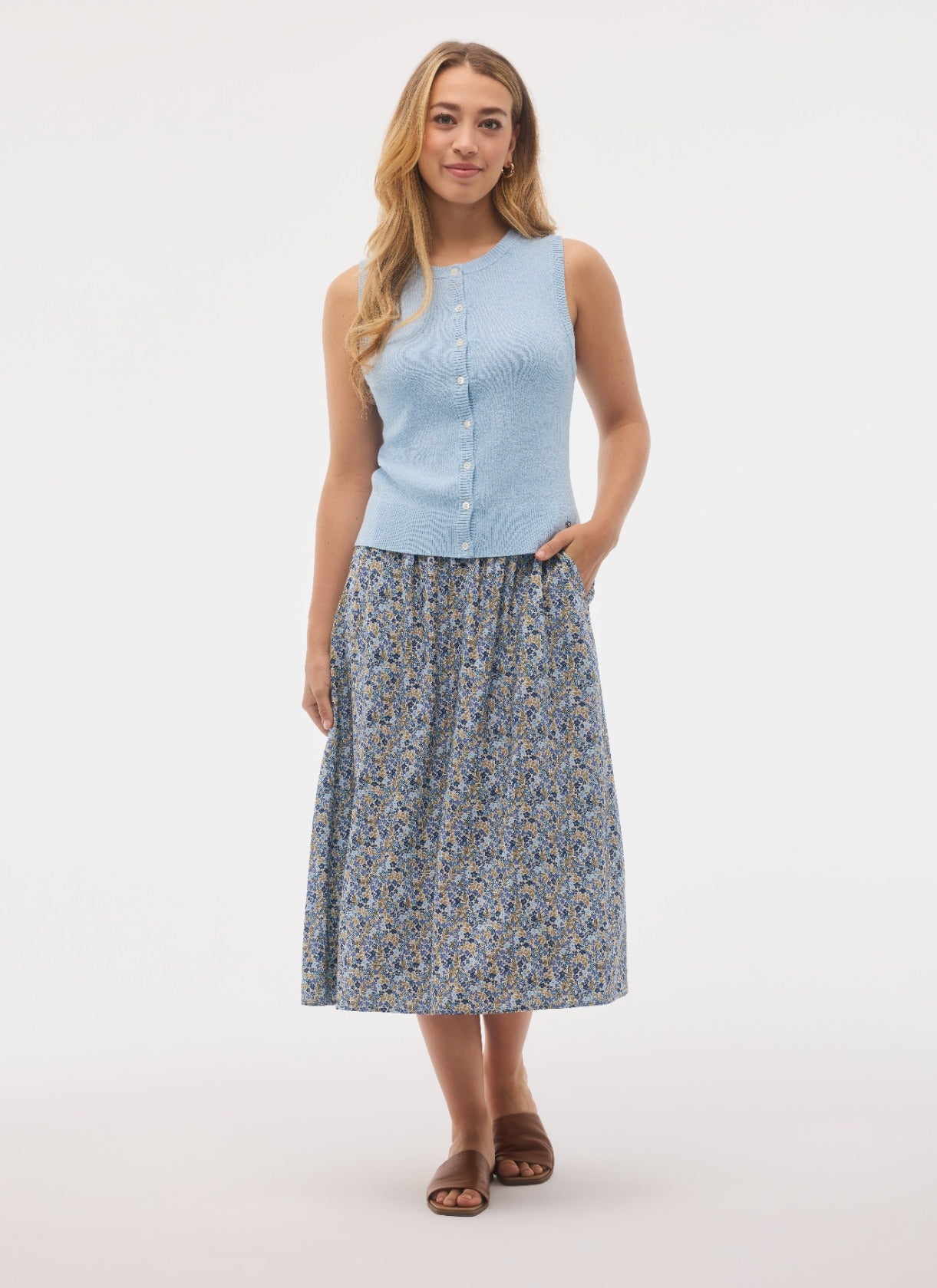 This feminine, buttoned sleeveless top captures simple elegance. Easy to dress up or down, it’s an ideal travel companion and a must-have for any carry-on. Ribbed detailing at the neckline, shoulders, and hem adds a clean, refined finish.