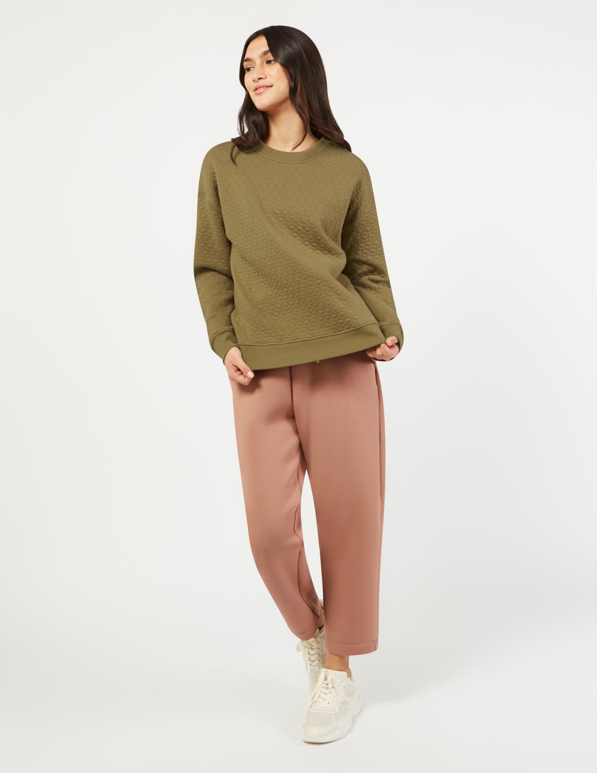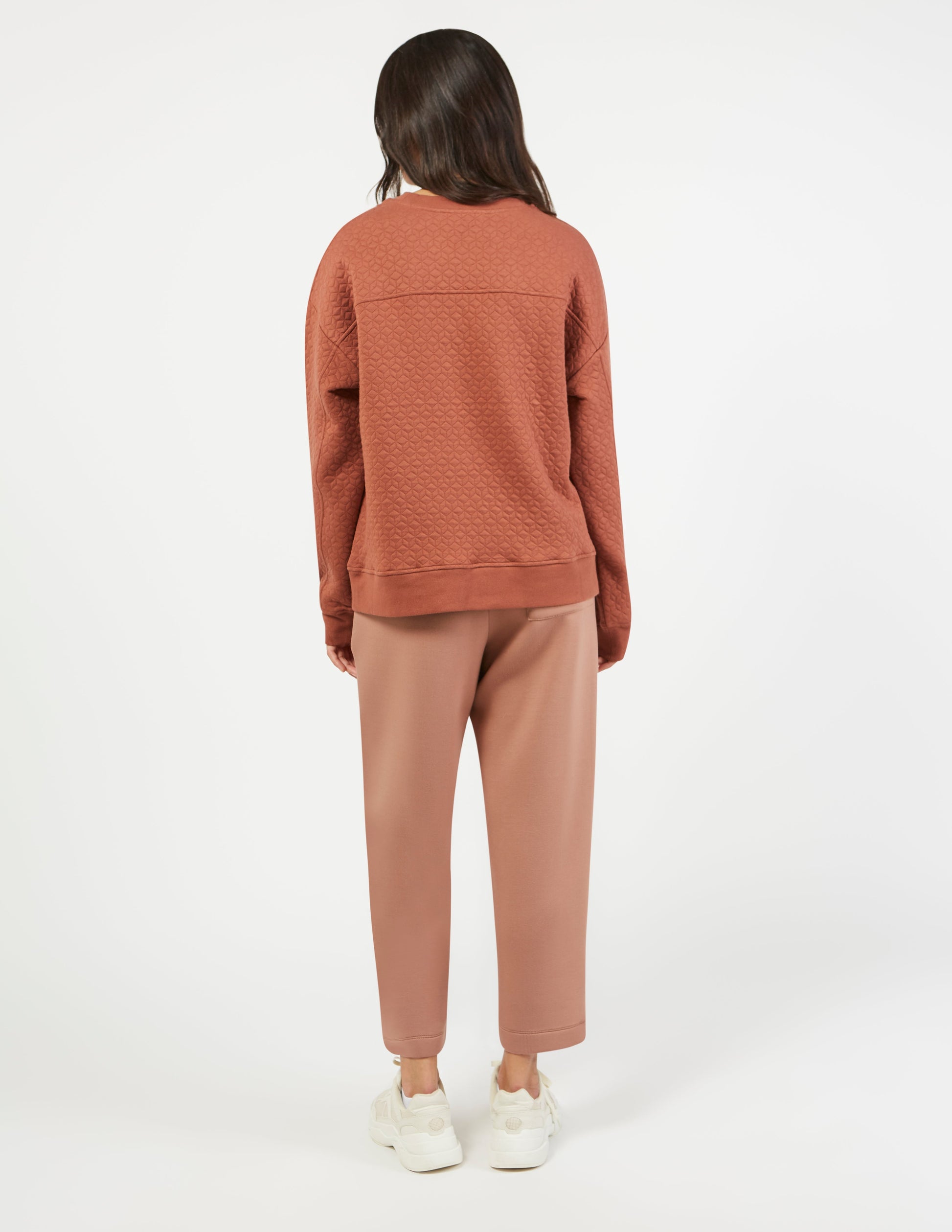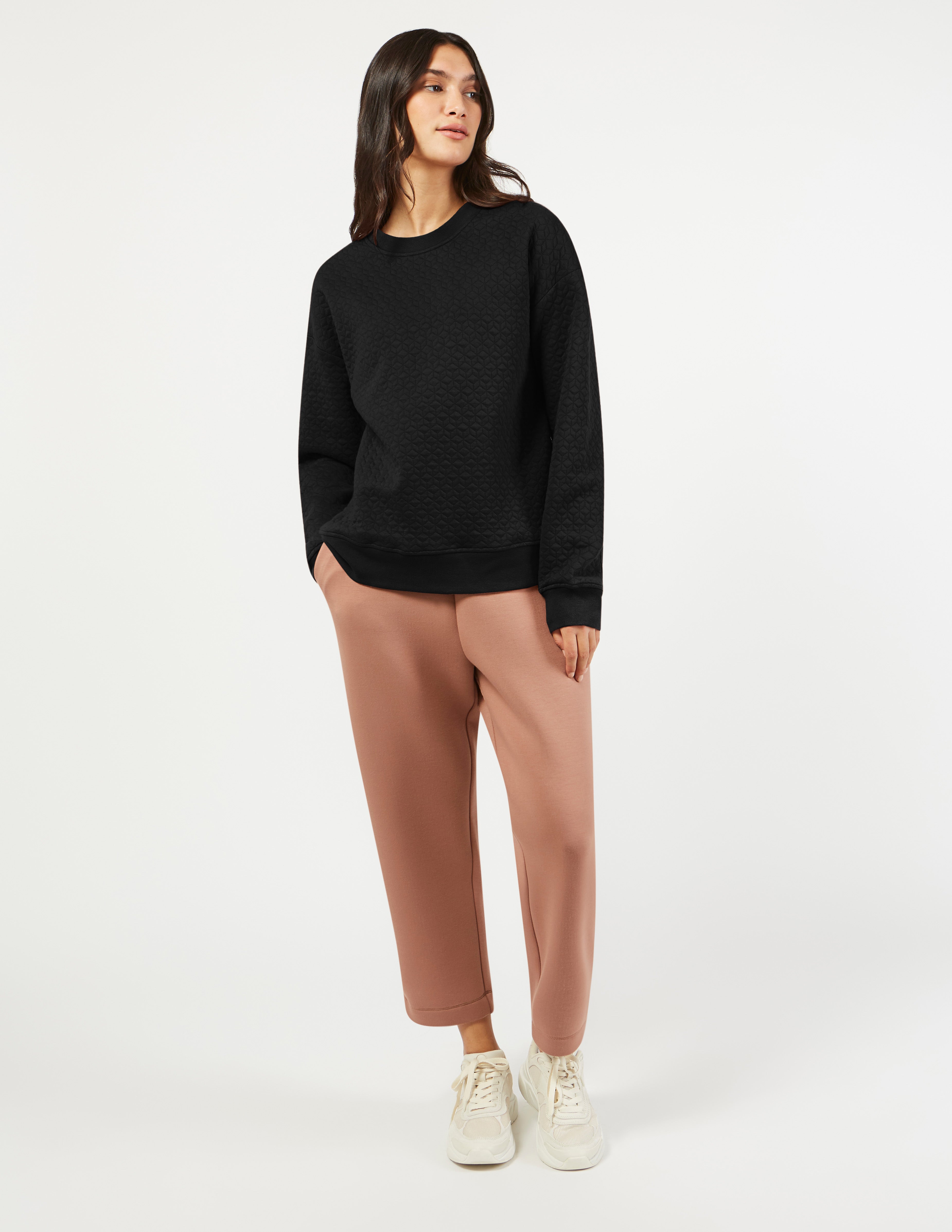 Round neckline top, dropped shoulder sleeves, rib knit details at collar, cuffs, and waistband, back yoke.