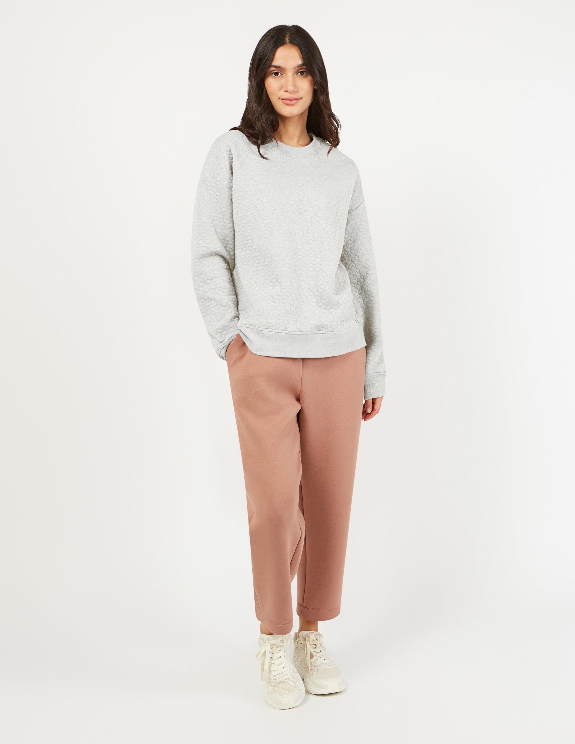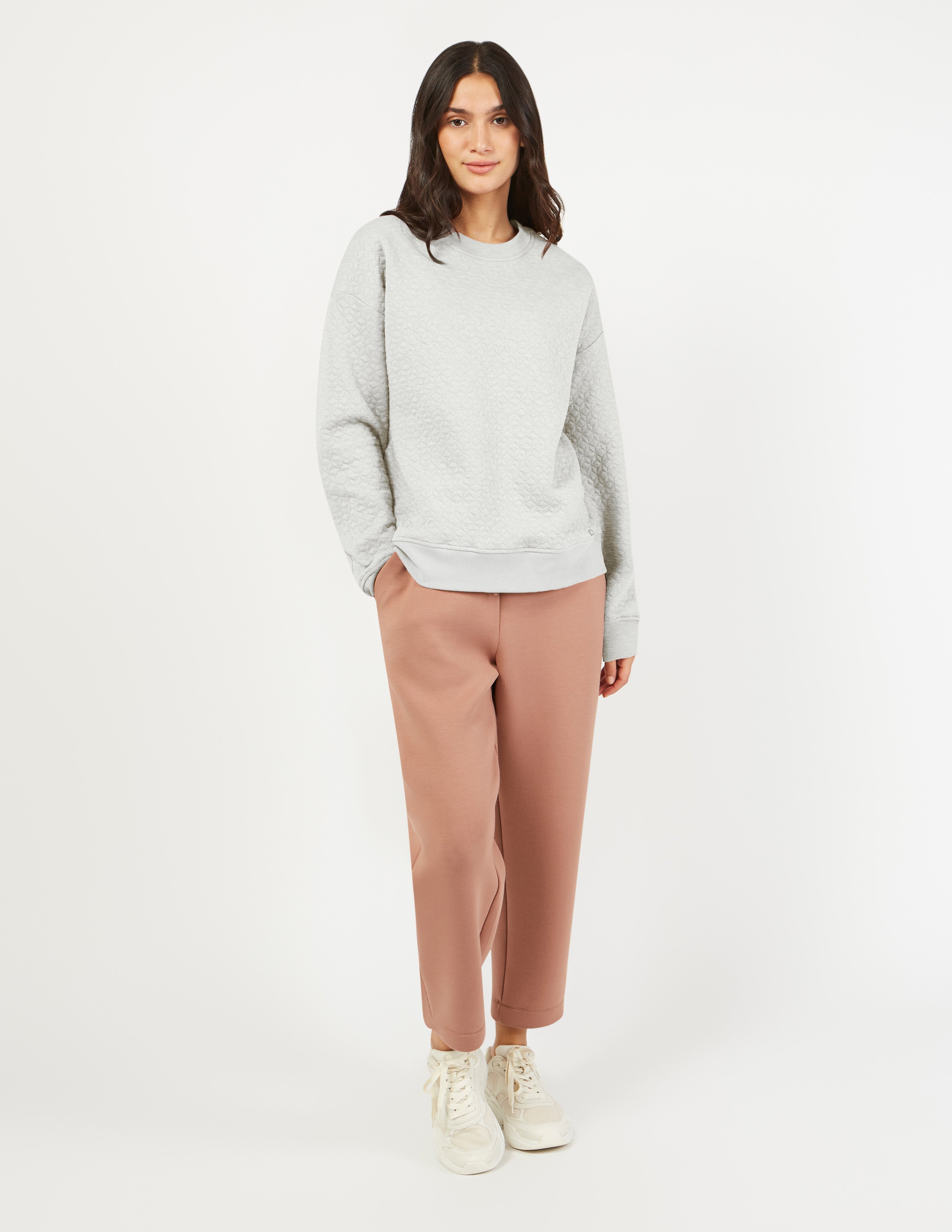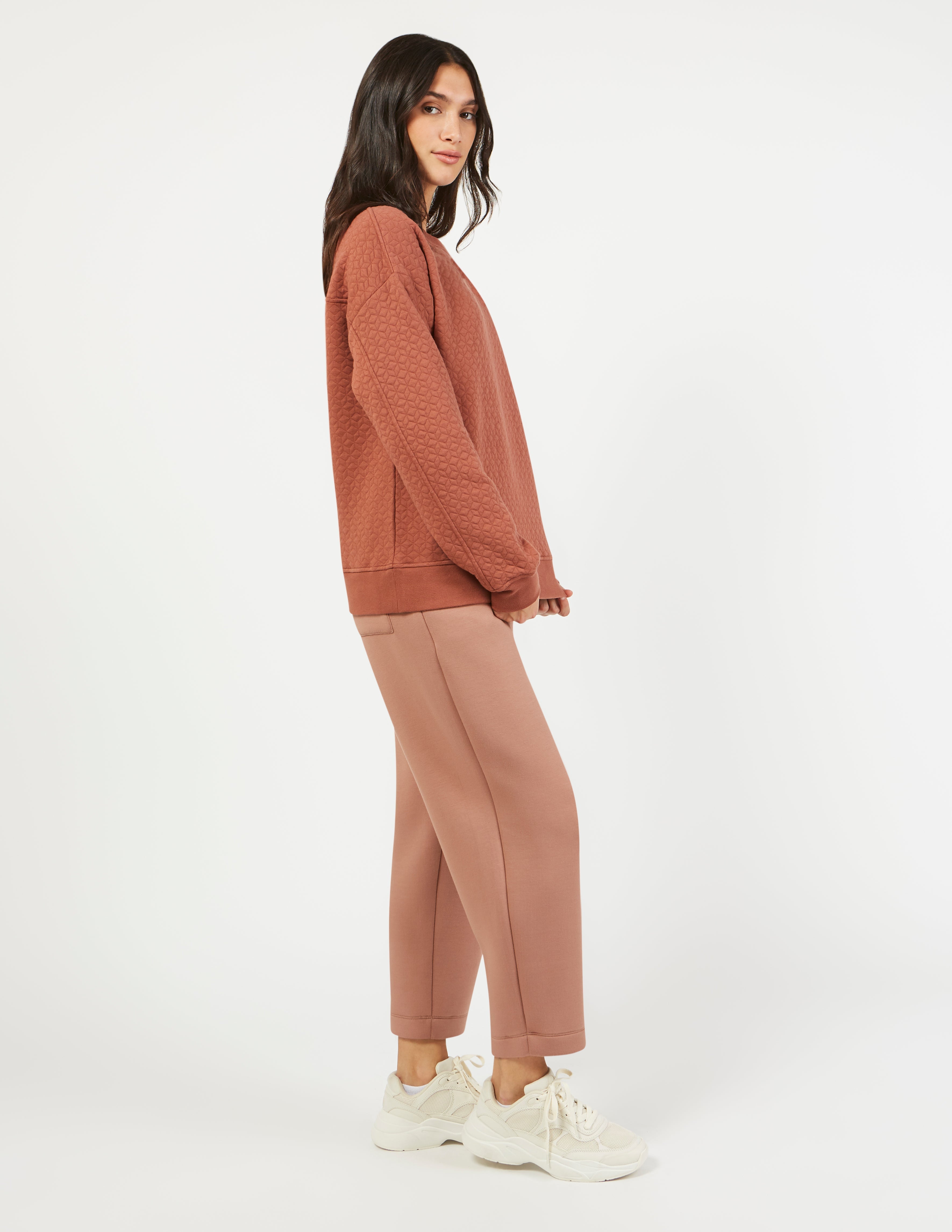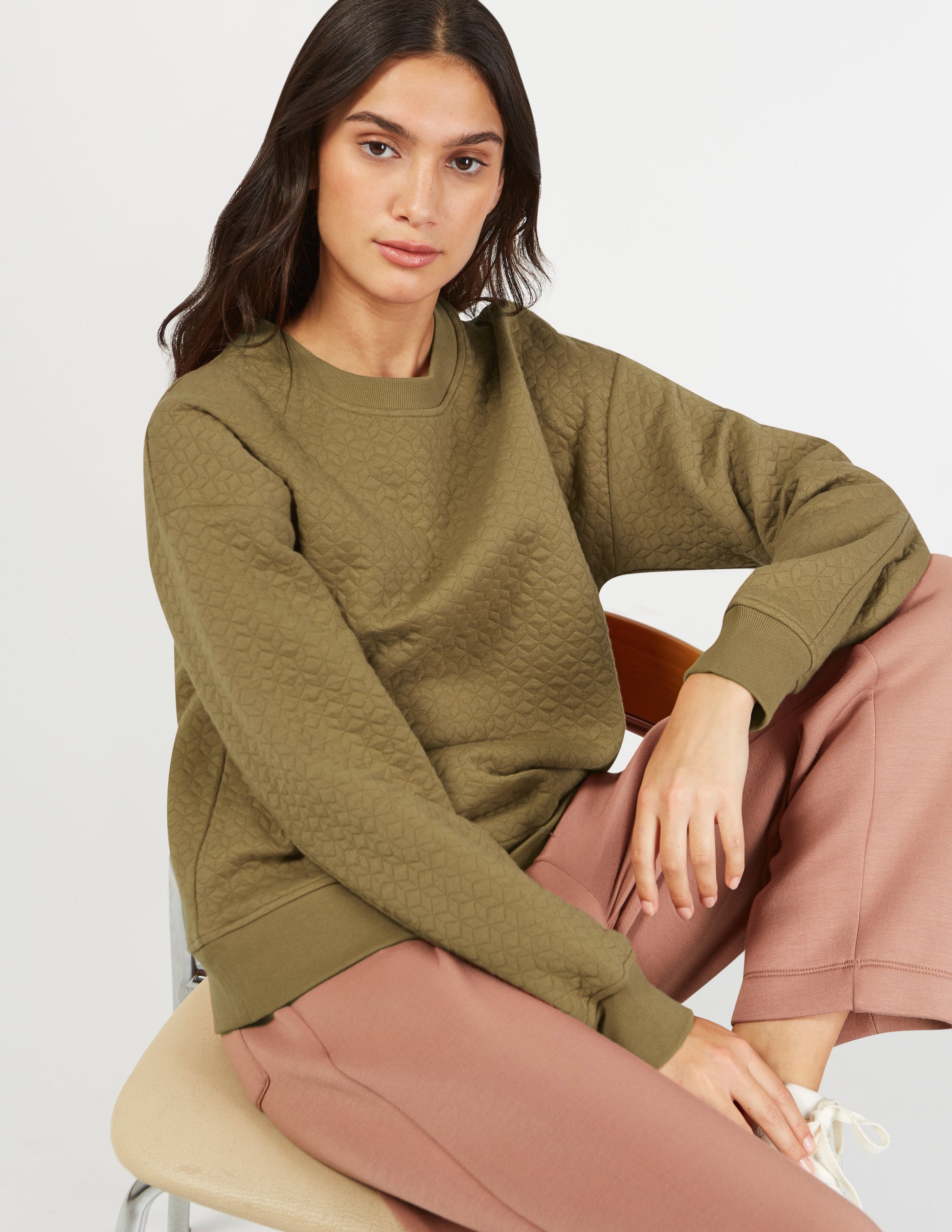 Round neckline top, dropped shoulder sleeves, rib knit details at collar, cuffs, and waistband, back yoke.